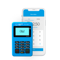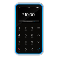 Aceita débito, crédito, código QR e Pix. Conexão Bluetooth com celular. Envia o comprovante por SMS e e-mail. Cartão com chip e por aproximação. 15 horas de bateria. 61x104x15,2 mm. 95 g.