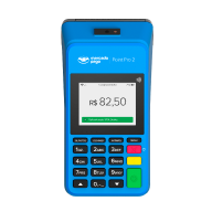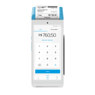 Aceita débito, crédito, código QR e Pix. Imprime o comprovante. Cartão com chip, tarja magnética e por aproximação. 72 horas de bateria. 201x80x62 mm. 440 g.